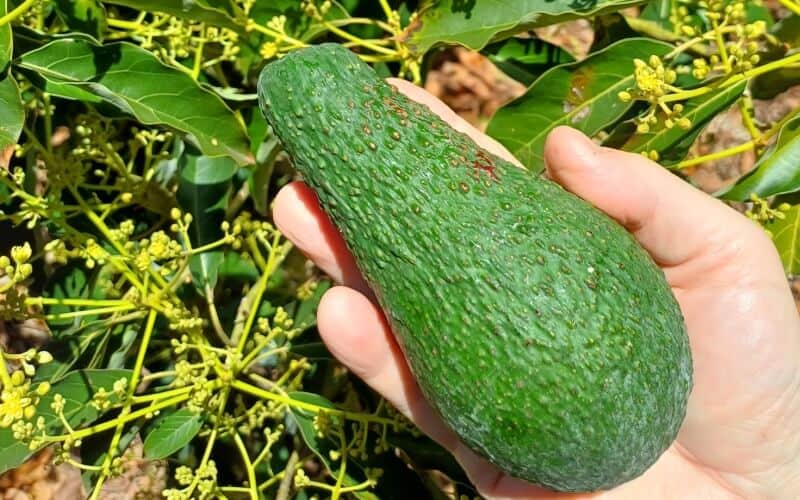The fruit is egg-shaped and larger than Hass. If you look closely, you’ll see tiny yellow dots on the green skin.